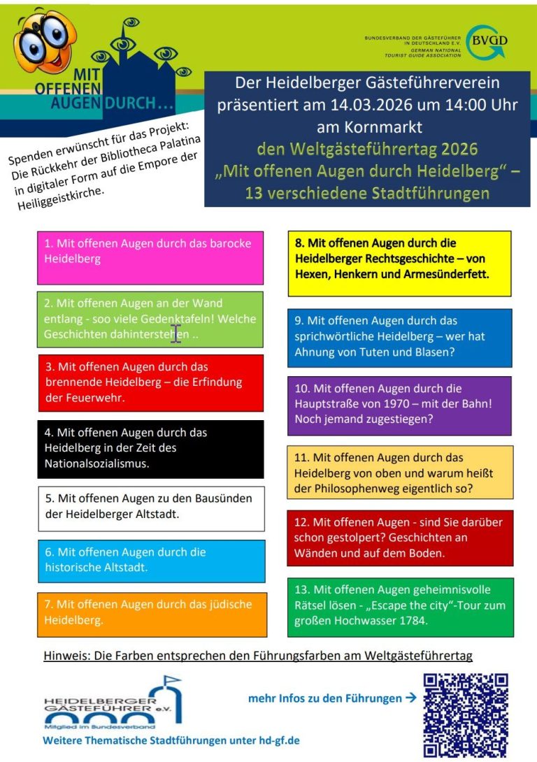Mehr Informationen und die Möglichkeit sich jetzt schon anzumelden finden sie, wenn Sie auf den unten stehenden Link klicken! Ich und die Heidelberger Gästeführer freuen sich auf Sie!